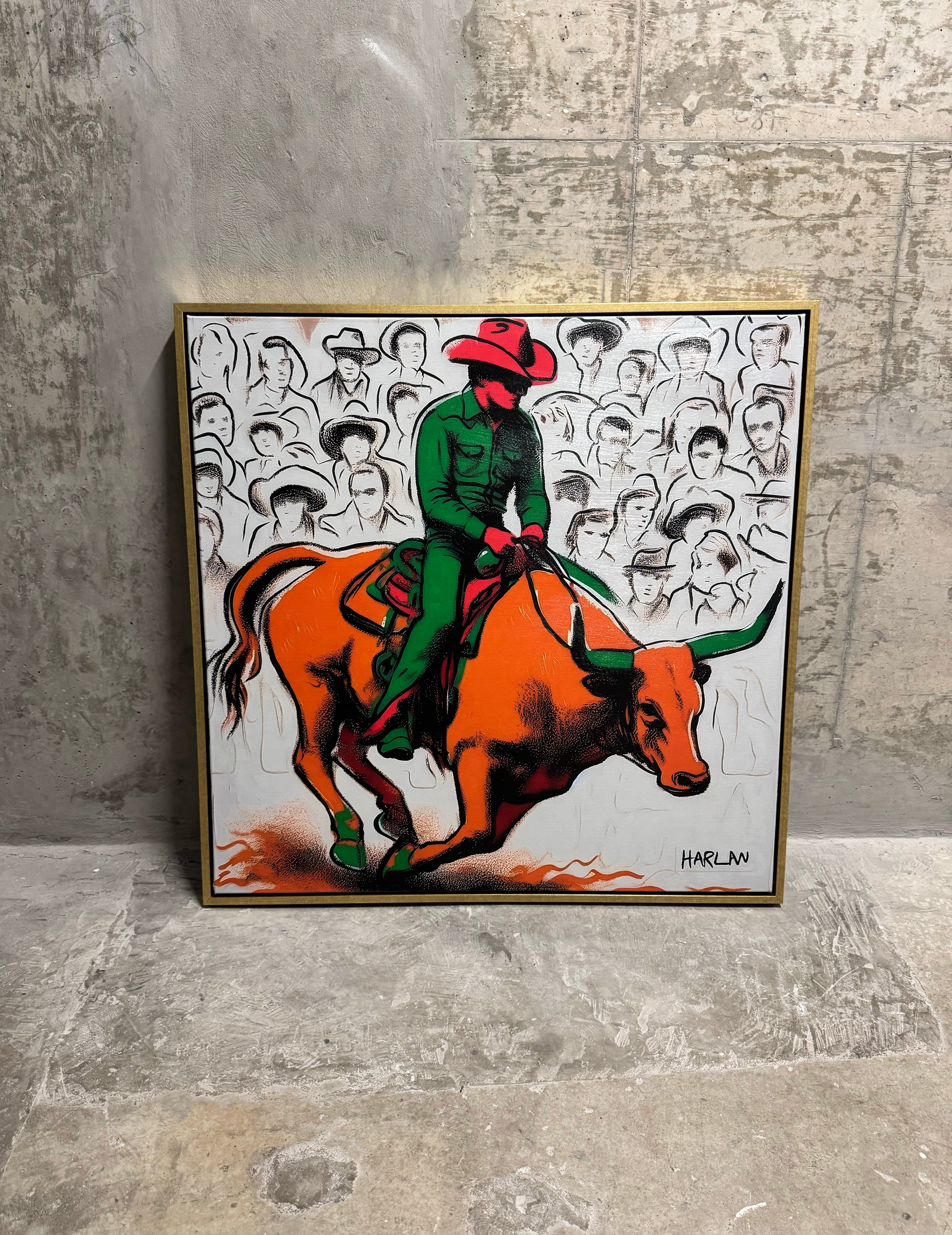 One-off high-quality giclée archival art on canvas with acrylic paint. The canvas is 38x38 inches with golden floating frame. This is an original one-of-one  artwork made by a Dallas based artist, Tay Harlan. This original artwork comes with a certified code and signature on the back. A hanging wire is installed on back for easy hanging.